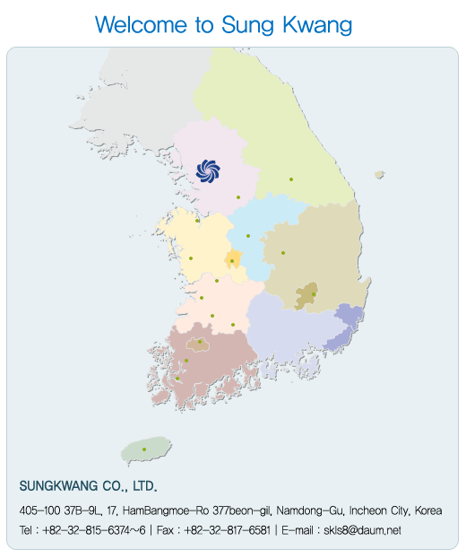 SungKwang 405-100 37B-9L, 17, HamBangmoe-Ro 377beon-gil, Namdong-Gu, Incheon City, Korea T : +82-32-815-6374~6 F : +82-32-817-6581